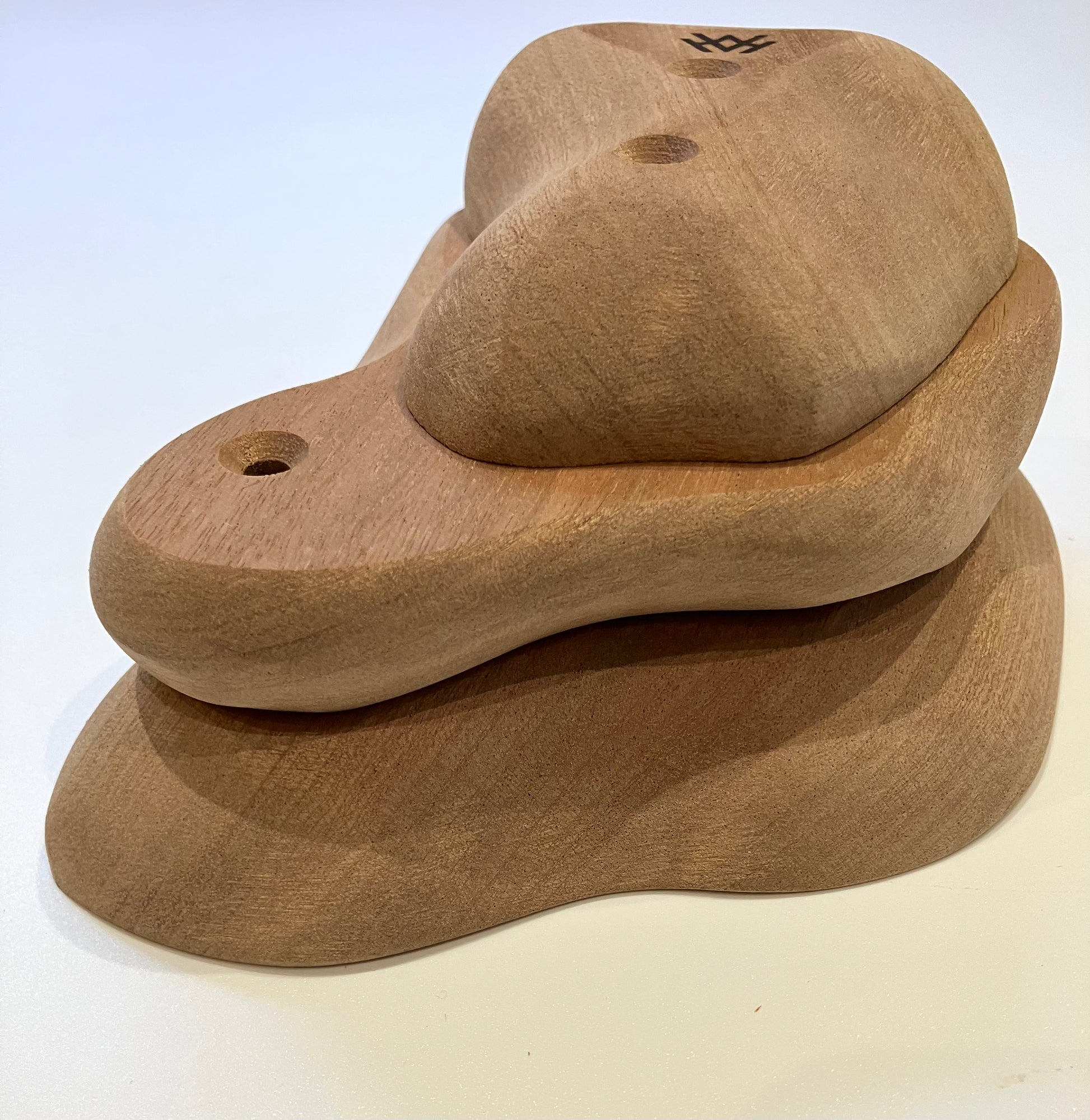 3 organic crimps that can either be used together or seperately. These holds are designed to closer resemble some of the shapes found on rock. All are approximately 25 deep positive in varying degrees. They can be used seperately or stacked together to proivide a multiple sided hold with different edges that are away from the wall so will feel a lot bigger than when up against the wall. This also allows them to be placed above a large hold on a full board.